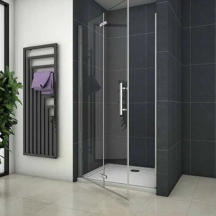 Effortlessly stylish and brilliantly space-saving, the Crown 800mm Frameless Bi-Fold Shower Door is the ideal solution for bathrooms where every inch counts.